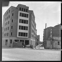 "Edifici en construcció al xamfrà de l’Avinguda de les Garrigues, a l’esquerra, i el carrer del Bruc, a la dreta, vist des de la plaça de Bores."