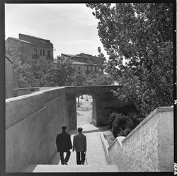 "Escales de baixada des del Pont Vell al carrer de Jaume II, amb diversos vianants descendint-hi."