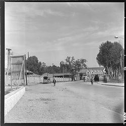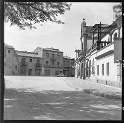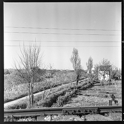 "Un pas a nivell travessa les vies del ferrocarril, probablement al final de l’Avinguda del President Josep Tarradellas, en direcció al barri dels Magraners. S’observen senyals ferroviàries i les barreres del pas a nivell, amb alguns edificis i vegetació a l’entorn."