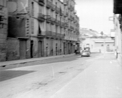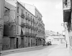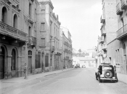 "Carrer del Joglar Segalà; a la dreta les ruïnes del Convent de l’Ensenyança; al fons l’edifici del Roser"