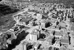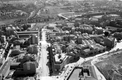 "Vista aèria de la ciutat des del nord; vertical aproximada de l’Avinguda Prat de la Riba (aleshores General Mola); elements destacables en primer terme: l’Avinguda Prat de la Riba i el Carrer Salmeron, i l’edifici de la Seguretat Social (Ambulatorio)"