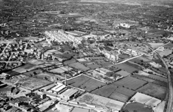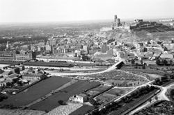 "Vista aèria de la ciutat des del nord (vertical aproximada del Secà de Sant Pere); elements destacables en primer terme: les hortes del futur barri"