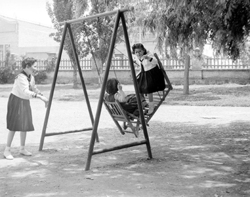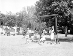 "Camps Elisis; Parque Infantil Ana Mari ; porxo del parc infantil, amb nenes jugant en un baldador"