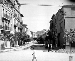 "Avinguda de Sant Ruf des del Carrer Príncep de Viana; al centre, una dona amb cistella caminant"