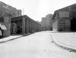 "Porxos i edifici de l’antic mercat de la Magdalena, des de Plaça Mossèn Jacint Verdaguer"