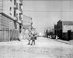"Carrer Pi i Margall, xamfrà amb l ‘Avinguda Prat de la Riba; a la dreta es veu parcialment l’edifici del Frontón de Lérida , al davant del qual hi ha un home amb bicicleta"