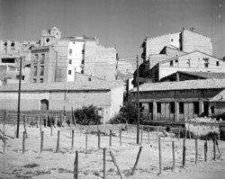 "Avinguda del Segre; lloc que és actualment la Plaça de Pere Sanahuja, sobre el riu Noguerola, en primer terme; al fons l’edifici dels Franciscans, entre els carrers Alcalde Fuster, Vila Antònia i Maria Sauret"