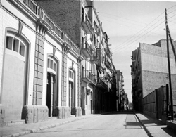 "Carrer Comerç, des del xamfrà amb el Carrer Riquer; en primer terme a l’esquerra l’antiga estació d'autobusos (Coneguda com l'Alsina )"