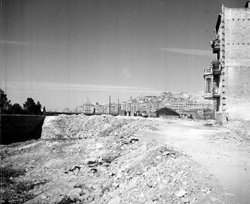 "Avinguda del Segre; obres de canalització i cobriment del riu Noguerola, en primer terme; al fons el Turó de la Seu Vella, amb el Claustre i el Campanar"