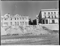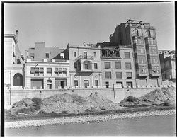 "Construcció del mur de contenció per ampliar l’Avinguda de Madrid; vista des del marge esquerre del riu; al fons altres edificis"