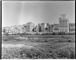 "Construcció del mur de contenció per ampliar l’Avinguda de Madrid; vista des del marge esquerre del riu; al fons el Banco de España"