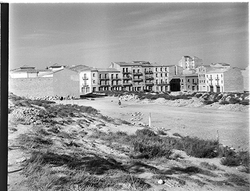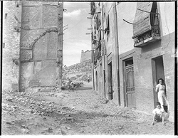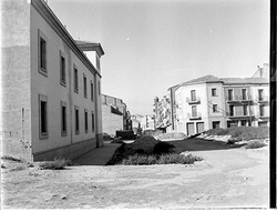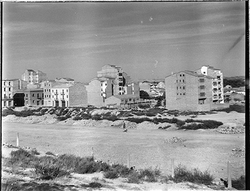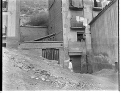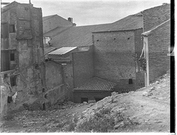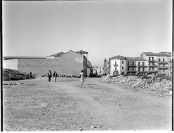 "Carrer Camp de Mart des del vessant del Turó de la Seu Vella; a l’esquerra, la caserna de la Policía Nacional (Policía Armada); al fons el carrer de Sant Martí i l’inici del Carrer Bonaire"