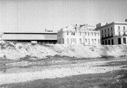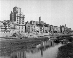 "Avinguda de Madrid; vista des del marge esquerre del riu; en primer terme l'edifici del Banco de España"