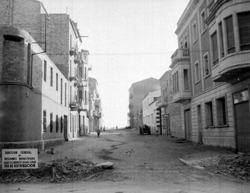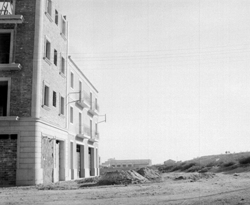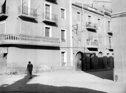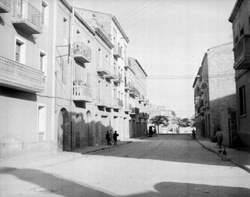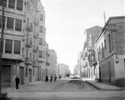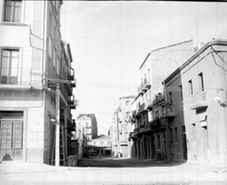 "El Carrer Bonaire, des del xamfrà amb el Carrer Balmes; a l’esquerra es llegeix el rètol DIRECCION GENERAL DE REGIONES DEVASTADAS. ABASTECIMIENTO AGUAS LERIDA. RED DE DISTRIBUCION ; a la dreta es veu parcialment l’edifici de la residència de les Esclavas del Immaculado Corazón de María, o Cordimariana"