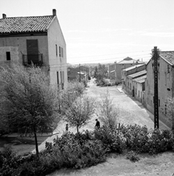 "Barri de Pardinyes; a la dreta, vista de l’antiga pujada del Camí de Corbins al pont sobre les vies del ferrocarril, a l’antiga estació de classificació ferroviària; en primer terme el Carrer Ramon Argilés"
