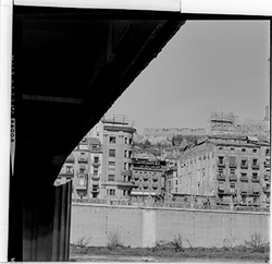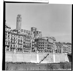 "Vista des del marge esquerre del Riu Segre, al dessota del Pont Vell; en primer terme, el mur de l'Avinguda del Segre, el Carrer Saragossa i l'Avinguda de Francesc Macià"