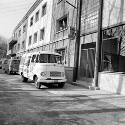 "Eduardo Velasco; concessionari oficial de vehicles Mercedes; furgoneta d’aquesta marca al Carrer Eduardo Velasco; duu publicitat de Industrias Cárnicas Baró ; marca i botiga de productes càrnics i embotits; aparcada al costat de l'edifici de tallers i exposició de vehicles; xamfrà dels carrers Eduard Velasco (esquerra) i Avinguda d'Alacant; barri de Cappont; edifici actualment propietat de la Caixa de Pensions per a la Vellesa i d’Estalvis (La Caixa), seu de la Llar de Jubilats Santa Cecília"