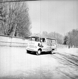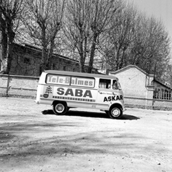 "Eduardo Velasco; concessionari oficial de vehicles Mercedes; furgonetes d’aquesta marca, i de la marca DKW, a l’interior dels tallers, al Carrer de Santa Cecília; barri de Cappont; demostració dels elevadors hidràulics"