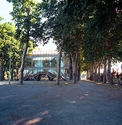 "Camps Elisis; barri de Cappont; final del passeig central, en primer terme; a l’esquerra, el Palau de Vidre; al fons, es veu parcialment l'Avinguda Josep Tarradellas, antiga Carretera Nacional II"