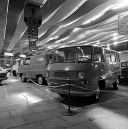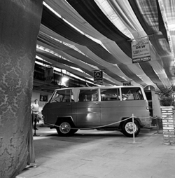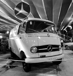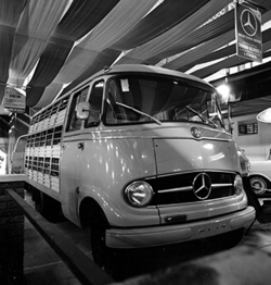 "Eduardo Velasco; concessionari oficial de vehicles Mercedes; furgonetes en exposició a l’interior del magatzem, amb decoracions de logos de la marca"