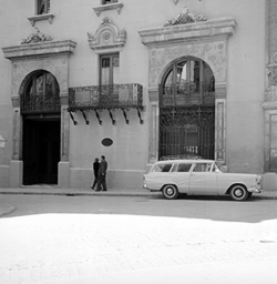 "Façana del Palau de la Diputació de Lleida, al Carrer del Carme, vista des de l’inici del Carrer Magdalena; destaca el conegut Balcó del Serraller , al centre"