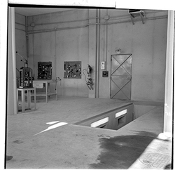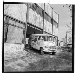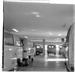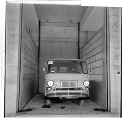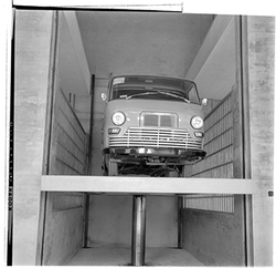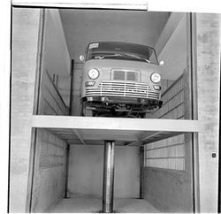 "Eduardo Velasco; concessionari oficial de vehicles Mercedes; furgonetes d’aquesta marca a l’interior dels tallers, al Carrer de Santa Cecília; barri de Cappont; demostració dels elevadors hidràulics"