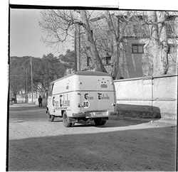 "Eduardo Velasco; concessionari oficial de vehicles Mercedes; furgoneta d’aquesta marca aparcada al Carrer Santa Cecília, al costat dels Camps Elisis, dels quals es veu una paret del Pavelló Antorxa; duu publicitat de Queserías Gran Toledo. Plaza de los Cuarteles 3-5 Lérida ; botiga d'elaboració de formatges"