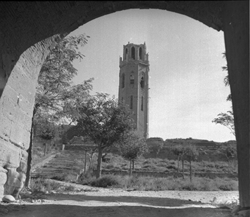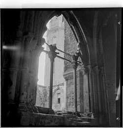 "Vista, des de l’interior d’un finestral de l'ala nord del claustre de la Seu Vella, amb bastides per a la reconstrucció de les arcades claustrals’ es veuen unes columnes apuntalades"