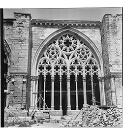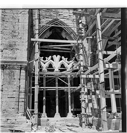 "Vista d’un finestral de l'ala nord del claustre de la Seu Vella, amb bastides per a la reconstrucció de les arcades claustrals"