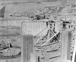 "Vista des del Baluard de la Mitja Lluna de les obres de construcció dels dipòsits d'abastament d'aigua a la ciutat de Lleida, al peu del Baluard del Rei; detall de les columnes de formigó"