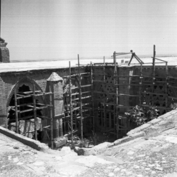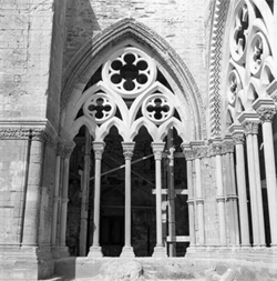 "Vista dels finestrals de l'ala nord des de la teulada del claustre de la Seu Vella, amb bastides per a la reconstrucció de les arcades claustrals; al fons hi ha el castell de la Suda, sobre el que es veu l'antena de Ràdio Lleida (E. A. J. 42 RADIO LERIDA)"
