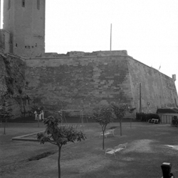 Vista de la base del Baluard de l'Assumpció de les muralles de la Seu Vella