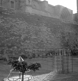 "Vista de la base del Baluard de l'Assumpció de les muralles de la Seu Vella, des del pont d’accés a la Porta Principal; a l'espai entre muralles s’hi ha instal·lat un conjunt d'atraccions infantils"