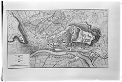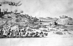 "Dibuix antic de la ciutat de Lleida, amb el pont en primer terme i la Seu Vella al fons, de l’any 1810, original de Suchet"