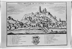 "Dibuix antic de la ciutat de Lleida, amb el pont en primer terme i la Seu Vella al fons, del segle XVII, original d'A. D. Perel"