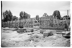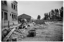 "Eduardo Velasco; construcció dels nous tallers, als carrers de Santa Cecília, Eduardo Velasco i Avinguda d'Alacant; inici i fonaments; vista des del Carrer de Eduardo Velasco; al fons els Camps Elisis"