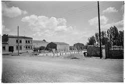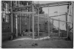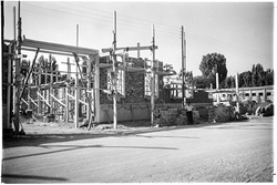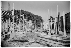 "Eduardo Velasco; construcció dels nous tallers, als carrers de Santa Cecília, Eduardo Velasco i Avinguda d'Alacant; aixecament de murs; vista interior; al fons, els Camps Elisis"