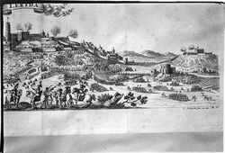 "Carrer de la Democràcia; al fons el Carrer de la Magdalena, la Costa de Magdalena i el Turó de la Seu Vella, amb les muralles, amb diversos vianants"