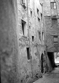 "Ruïnes del Convent de l’Ensenyança; al fons el Carrer de les Monges i campanar de l’església de Sant Llorenç"