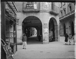 "Plaça de Sant Joan; porxos de dalt amb el Pilà del General, monument a Blondel"