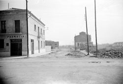"Zona de Balàfia; Carrer del Berguedà des de la carretera nacional 230, actual Avinguda Alcalde Porqueres; a l’esquerra la Farmàcia Moretó."