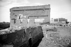"Castell dels templers de Santa Maria de Gardeny; el castell amb les muralles des de l'est; al fons les casernes militars"