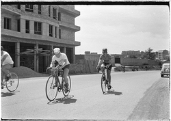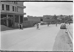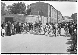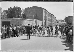 "Cursa ciclista pels carrers de Lleida, organitzada pel Col·legi Montserrat dels Germans Maristes; moment de la sortida al Carrer Bisbe Irurita; al fons el Santuari de Santa Teresina (Tereseta), i la Plaça de les Missions; a l’esquerra, inici del Carrer Pica d’Estats"