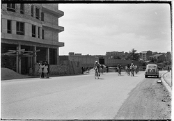 "Cursa ciclista pels carrers de Lleida, organitzada pel Col·legi Montserrat dels Germans Maristes; moment de la cursa; al Carrer Pius XII; al fons el Turó de Gardeny"