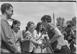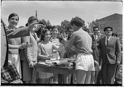 "Cursa ciclista pels carrers de Lleida, organitzada pel Col·legi Montserrat dels Germans Maristes; lliurament de trofeus per part dels guanyadors"