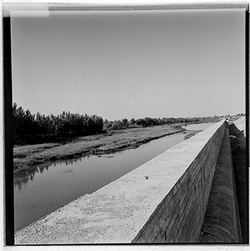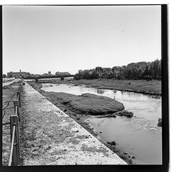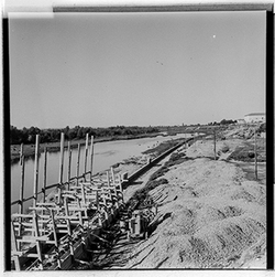 "Construcció del mur de contenció per ampliar l’Avinguda de Madrid; vista des del marge dret del riu; al fons el xoperal de Cappont"