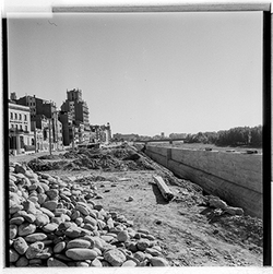 "Construcció del mur de contenció per ampliar l’Avinguda de Madrid; vista des del marge dret del riu; al fons els Camps Elisis"