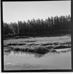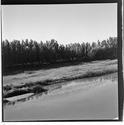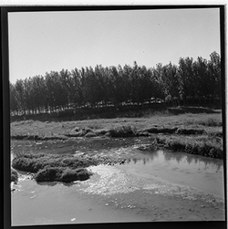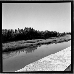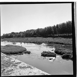 "Construcció del mur de contenció per ampliar l’Avinguda de Madrid; vista des del marge dret del riu; al fons el xoperal de Cappont"