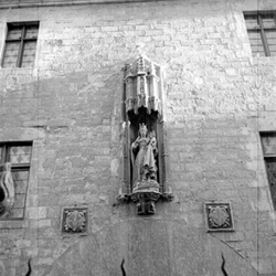"Façana de l'Antic Hospital de Santa Maria, seu de l'Institut d'Estudis Ilerdencs; detall de la Mare de Déu i escuts"