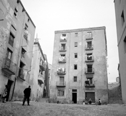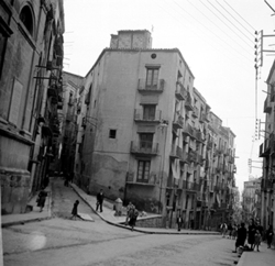 "Inici del Carrer del Joglar Segalà des del Carrer del Roser; a la dreta les ruïnes del Convent de l’Ensenyança"